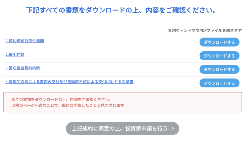まずは以下の画像のように、4つの書類のダウンロード画面が出てくるのですべてダウンロードし確認、確認後に「投資家申請を行う」へと進みます。