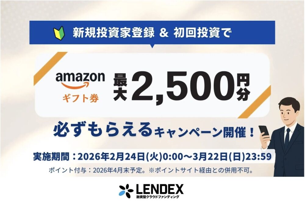 結論:LENDEXは最大2500円分のアマギフがもらえるキャンペーン中【2026年3月22日まで】