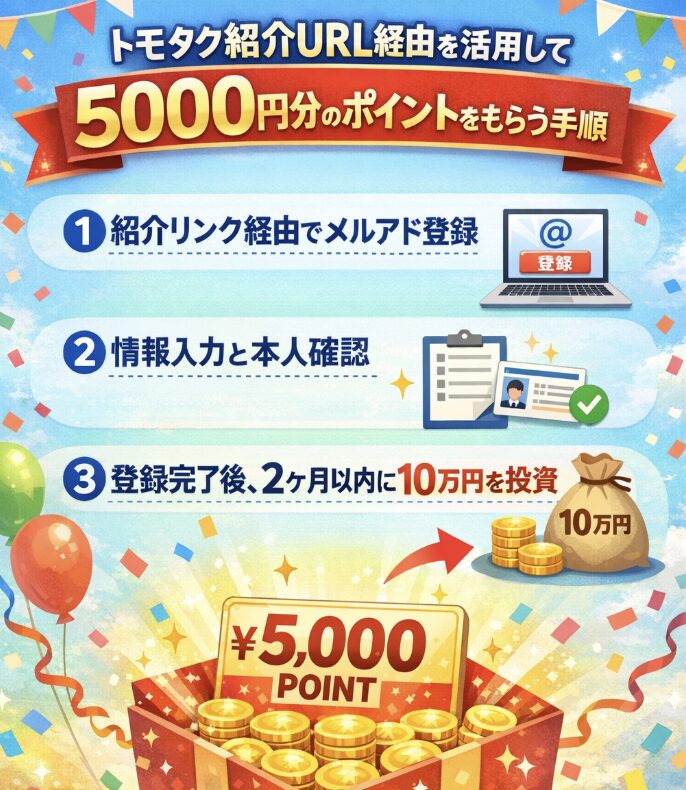 結論:あなたがトモタク紹介キャンペーンの紹介URL経由で登録+10万円以上を投資すれば5000円分のポイントがもらえます!!