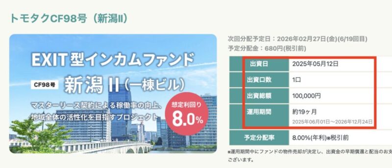 筆者は2026年2月時点でトモタクCF98号の投資案件、ファンドを運用中です↓↓