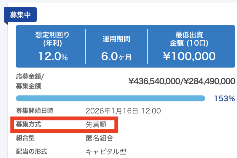 の2つのパターンで募集されますが、2026年1月に募集されているファンドをみると先着式の案件が多くなっています。