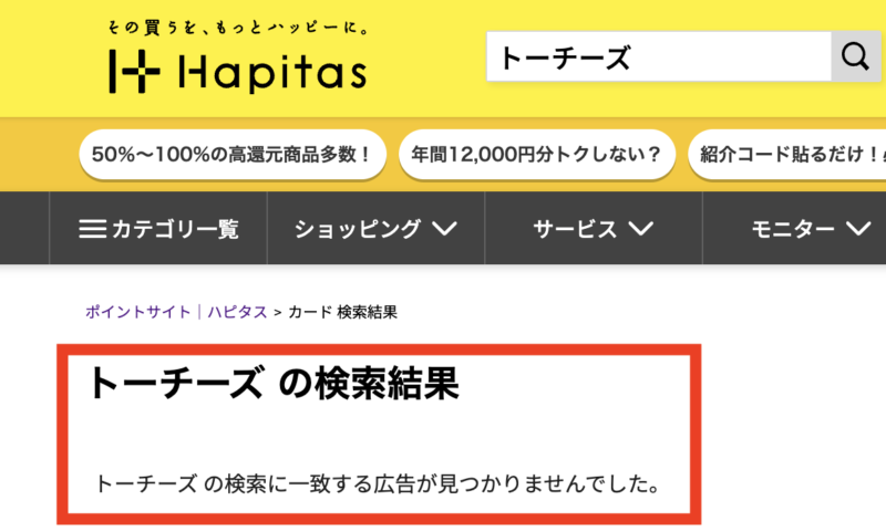 2026年1月時点でトーチーズはハピタスやモッピーといったポイントサイトに掲載されていません。