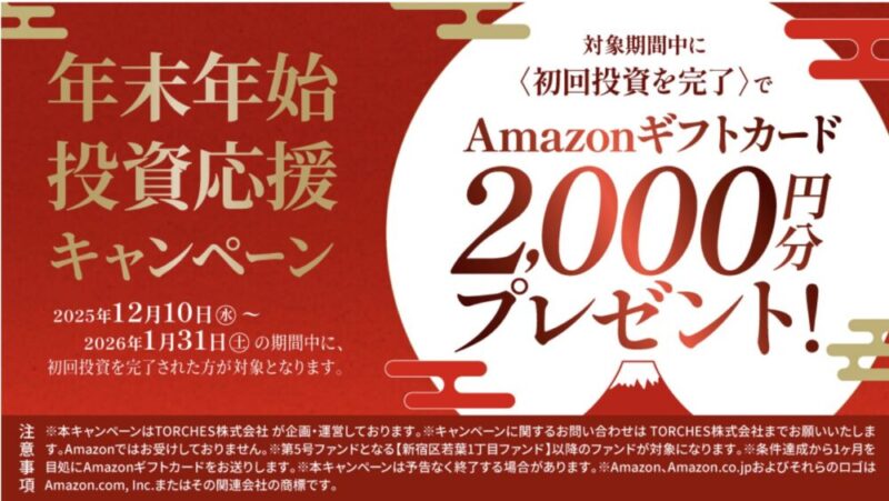 【2026年1月31日まで】トーチーズでは年末年始投資応援キャンペーンを実施中。今ならトーチーズが募集するファンドに投資すると2000円分のAmazonギフト券がもらえます!!