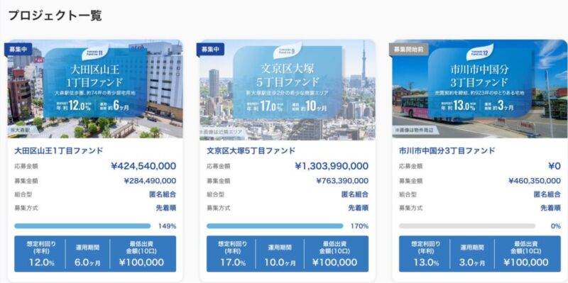 最低投資金額は1万円、5万円、10万円のファンドがこれまでに出ているので、まずは気軽に投資してみたいという方は少額から試してみるのがリスクを抑える意味でもおすすめです。