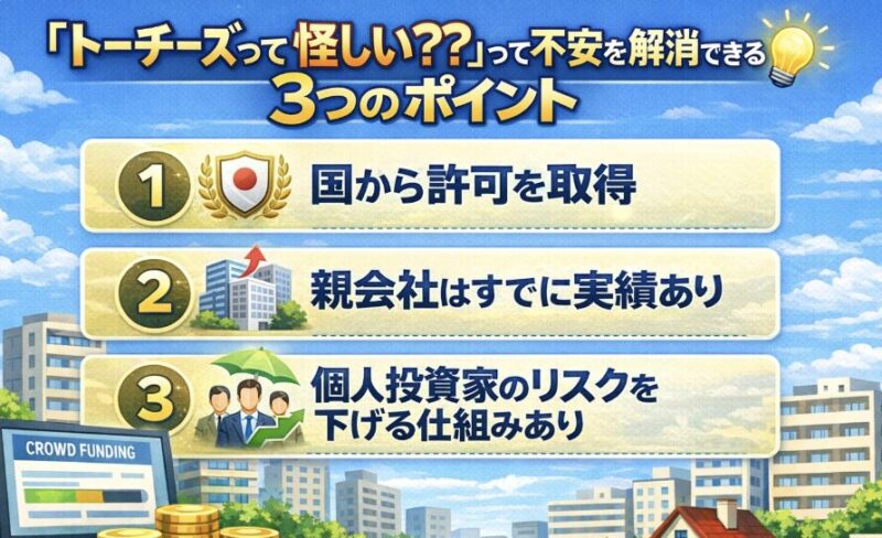 - TORCHES(トーチーズ)の投資の仕組み、怪しいと思われるポイントと不安を解消できるポイント