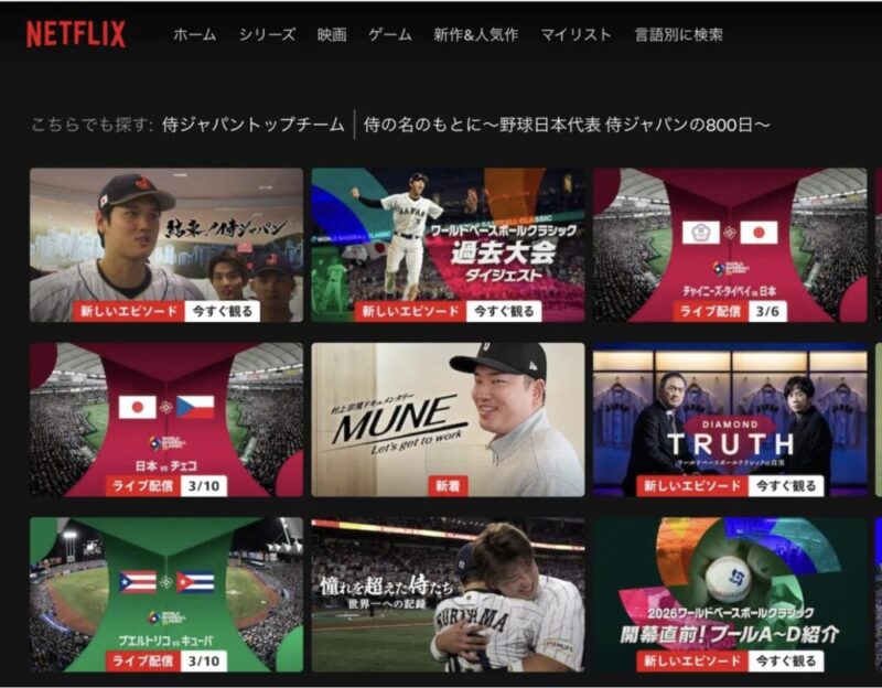 なお、ネットフリックス日本版はWBC2026、侍ジャパンの試合のライブ中継に加えて、2023年のWBCのダイジェスト映像や村上選手のドキュメンタリーなど関連コンテンツも多数みれます!!