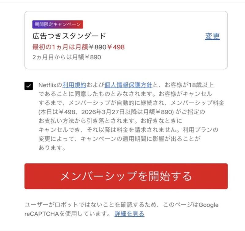 プランを選択⇒注意事項を確認しチェックマークを入れる⇒メンバーシップを開始するへと進めばネットフリックスの契約が完了。