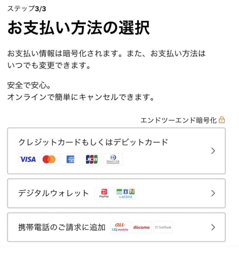 アカウント作成が完了したあとは支払い方法の設定へ。支払い方法はクレジットカード、PayPayなどのデジタルウォレット、携帯電話での請求から選べます。