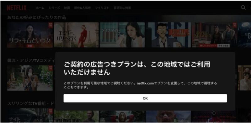 そして、日本版ネットフリックスを筆者が在住しているベトナム🇻🇳からアクセスしてみると、以下の画像のように「この地域ではご利用いただけません」というメッセージが出てきました…