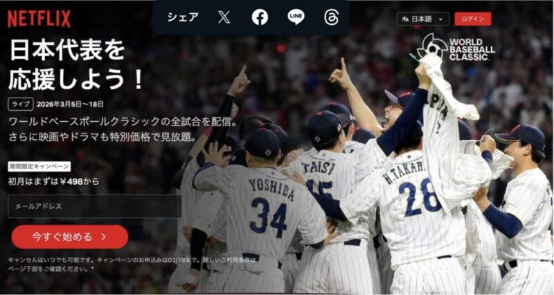 そして今回、WBC2026、侍ジャパンの試合を独占配信している日本版ネットフリックスはWBC期間中はキャンペーンを開催中!!