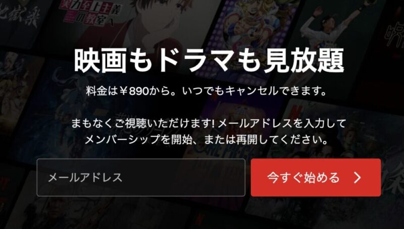 日本版ネットフリックスの契約はまずメールアドレスを入力⇒今すぐ始めるへをクリックします。